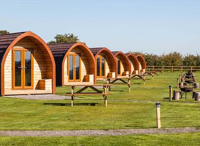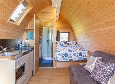 Brand new camping cabins, close to the village of Linton in the Kent countryside, bounded by plum orchards and beautiful views towards the Weald. The pods are well insulated and offer a double bed and a sofa bed, as well as your own private en-suite bathroom with conventional flushable loo. The kitchen has a mini freezer, fridge and electric hob, as well as lots of useful utensils, plates, mugs and everything you need. There is even a little fold away table. Underfloor heating makes it cosy on cooler evenings if its chilly outside.