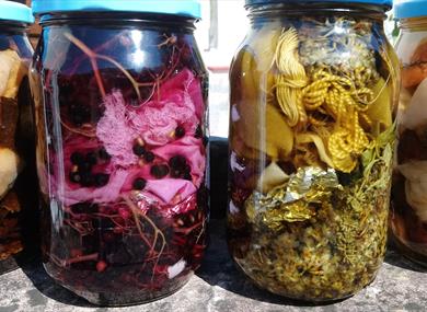 You’ll then head into the Learning Space for a tutored session, led by Sheilagh, where you’ll learn about eco-colour from different plant materials, the magic mix of rust and tannins, and see examples of eco-printing on paper and fabric. You'll create your own 'Solar jar' with foraged items and scraps of vintage linens and threads which can then be used in a variety of projects.
