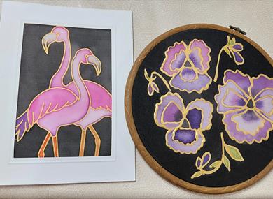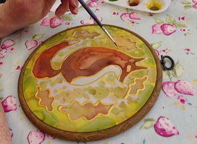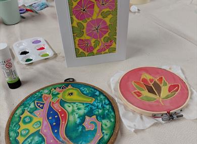You will first experiment and practice on a pre-stretched piece of silk, before designing and painting your own 7 inch suncatcher, then paint a ready printed design for a card, which you can frame or give to a friend. Watch the vibrant colours flow in this relaxed beginner friendly workshop.